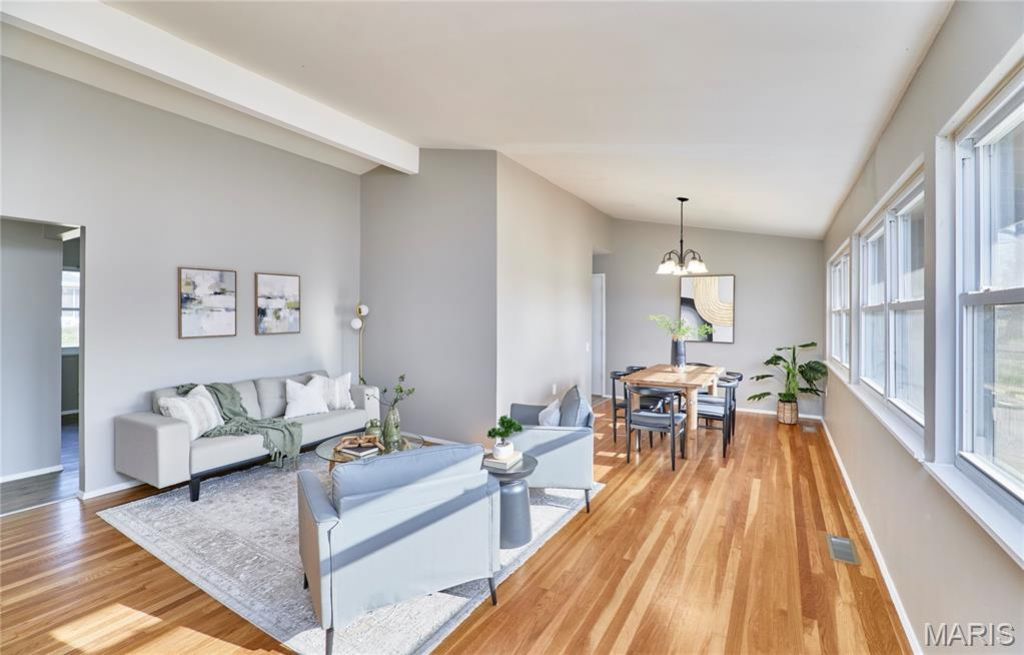 Welcome home to this beautiful, move-in ready ranch with tons of amazing updates and features! You'll love the bright and open floor plan, updated kitchen and bathrooms, finished basement, fenced in backyard, 2 car garage, and more! Step inside to the light & bright living room with tons of natural light, beautiful hardwood floors, and vaulted ceiling. The dining room is open to the living room and leads to the beautiful kitchen. The spacious eat-in kitchen boasts vaulted ceiling, lots of custom cabinetry, pantry, breakfast room, and access to the covered patio and large, fenced backyard. The primary bedroom offers beautiful hardwood floors and a full bathroom with modern updates. 2 additional bedrooms and a full hall bathroom complete the main floor. Lots more living space to love in the finished lower level with cozy carpeting and a large bar, perfect for entertaining! Great location just minutes from shopping, restaurants, and with easy highway access, you won't want to miss this charming ranch home!