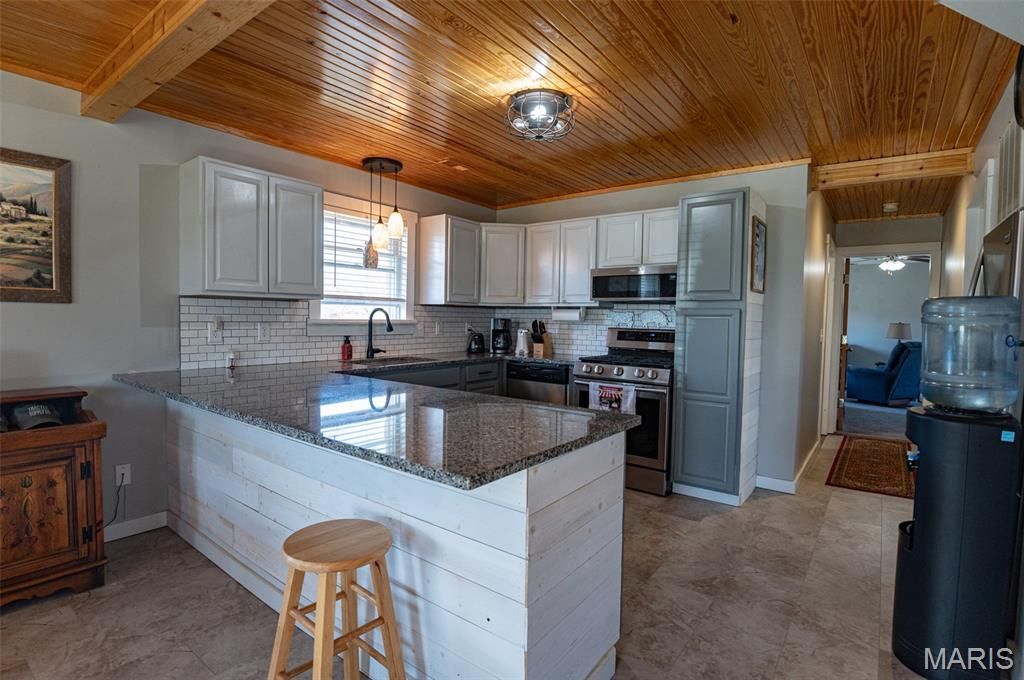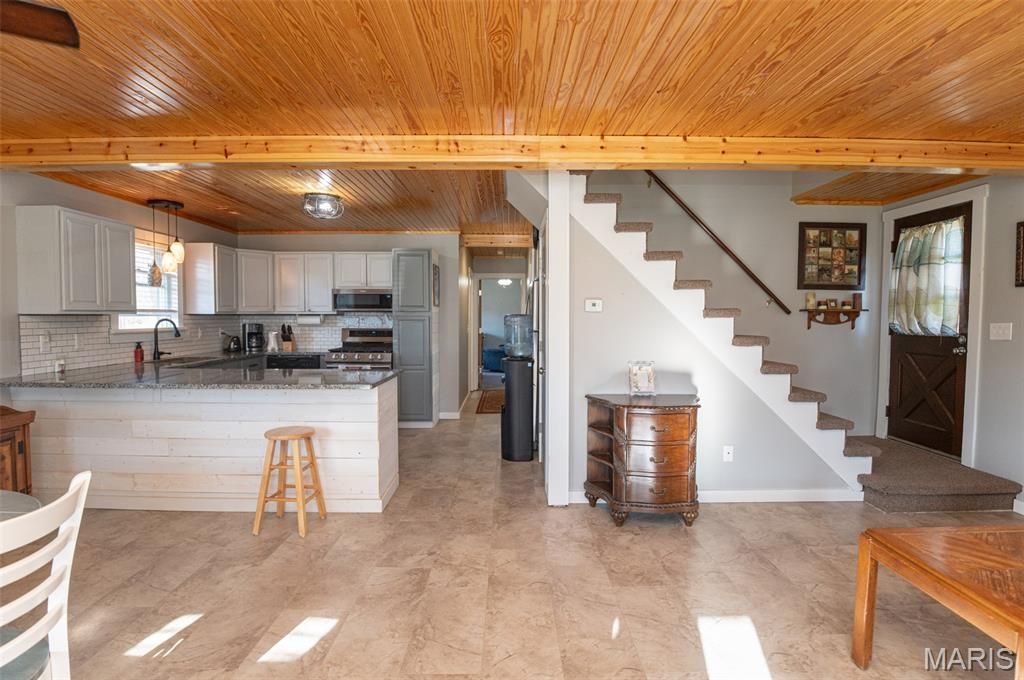 Charming and full of character, this 3 bedroom, 2 bathroom home sits on a spacious corner lot and offers the perfect blend of rustic appeal and modern updates. From the moment you arrive, you'll love the inviting curb appeal with its unique stone exterior, welcoming front porch, and peaceful setting.Step inside to find a warm and cozy interior featuring beautiful wood ceilings, abundant natural light, and a functional layout designed for comfortable living. The updated kitchen boasts stylish cabinetry, sleek countertops, stainless steel appliances, and a classic tile backsplash-perfect for everyday living and entertaining.The main living area offers a comfortable space to relax, complete with charming finishes and a touch of rustic elegance. Upstairs and additional bedrooms provide flexibility for family, guests, or a home office.Outside, the large corner lot provides plenty of room to enjoy the outdoors, garden, or entertain. The oversized garage offers ample space for vehicles, storage, or a workshop.This move-in ready home combines charm, updates, and space-all in one inviting package. Don't miss your opportunity to make it yours!